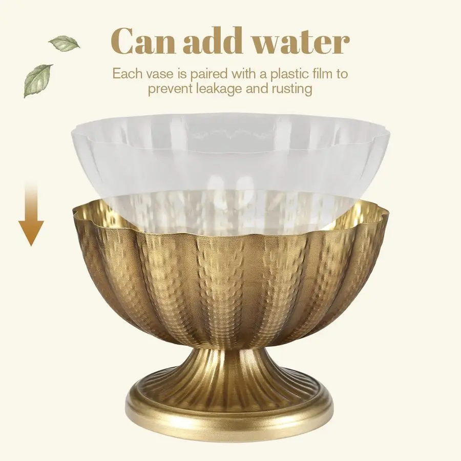 With a golden finish and textured design, these hammered bowl vases are a good choice for table centerpiece. Perfect for displaying flowers or as a favorite fancy fruit bowl, sturdy and elegant.