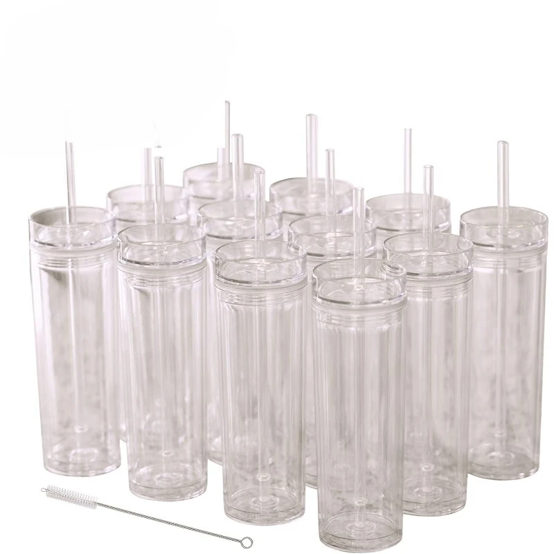 24 Clear Skinny Tumblers with Lids and Straws | 16oz Reusable Cup Double-Wall Clear Tumbler with Lid and Straw