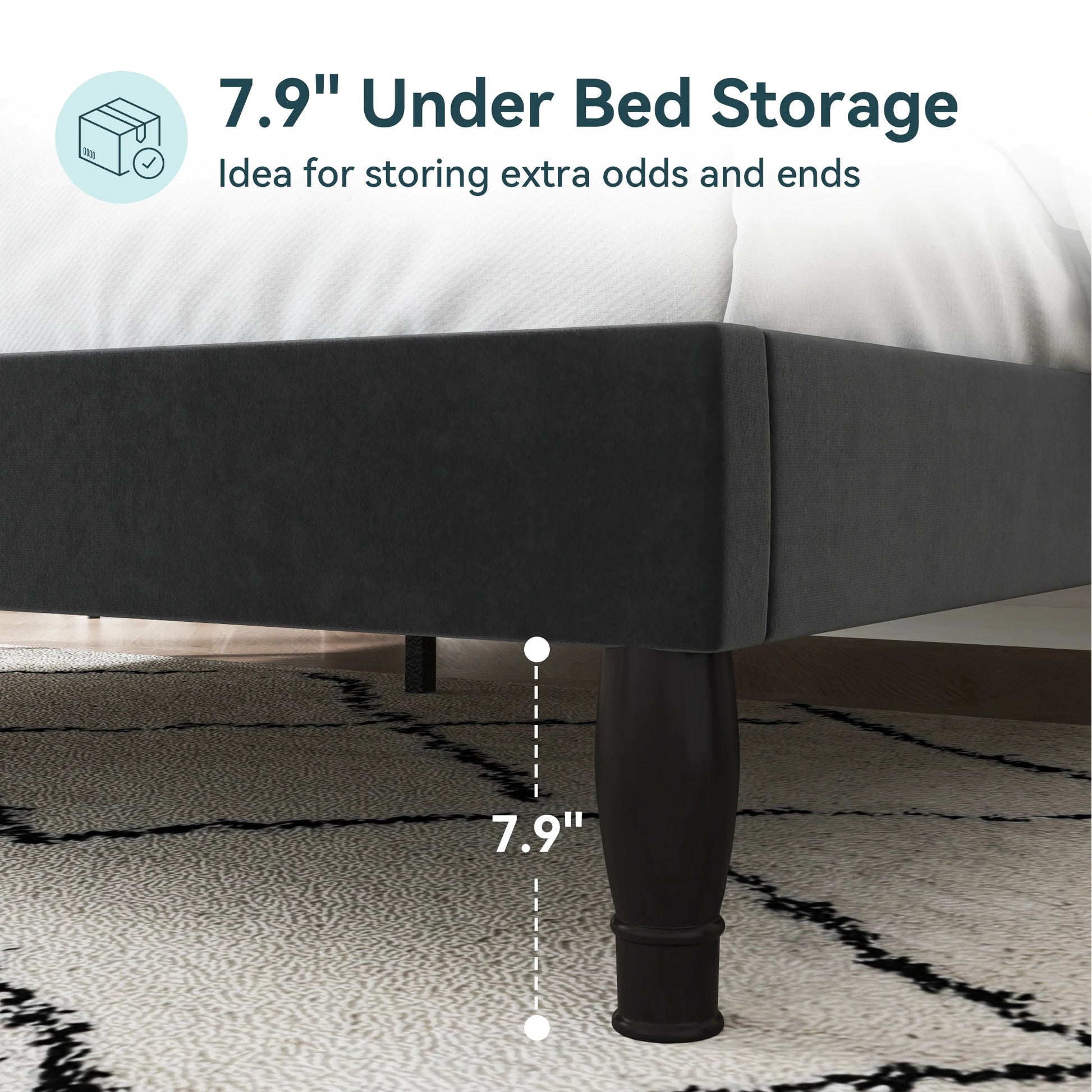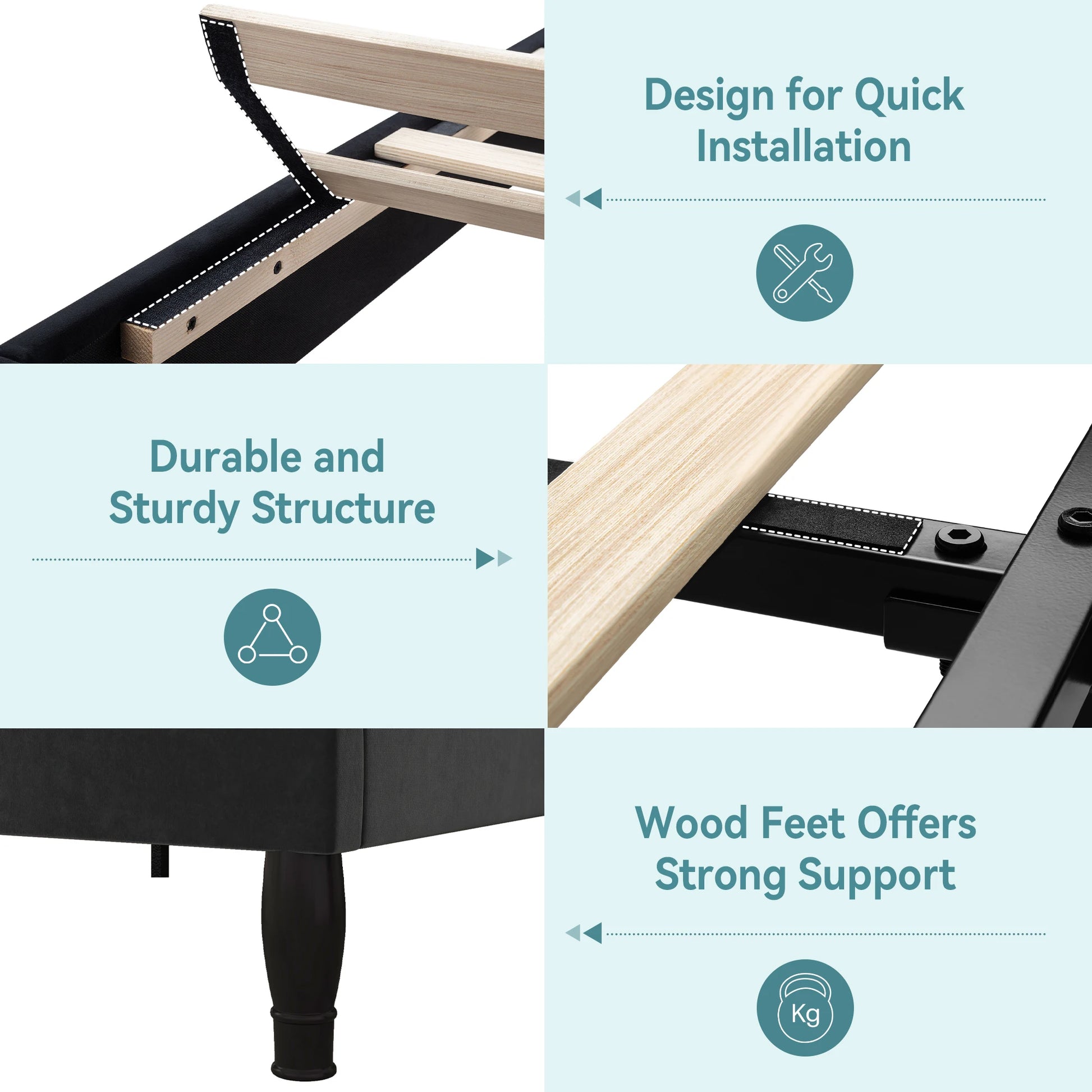 This elegant velvet platform bed features a luxurious tiara headboard with diamond button tufting and rivet details, creating a regal focal point for your bedroom. High-quality wooden slats provide solid support for your mattress, enhancing comfort and prolonging mattress life, and offers a spacious under-bed storage area for storing your valuables. The innovative platform design eliminates the need for box springs while solid wood legs ensure stability and a safe sleeping environment.